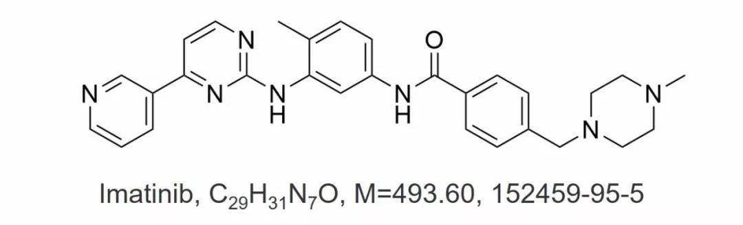 格列衞 (Gleevec),學名叫甲磺酸伊馬替尼(imatinib mesylate)。這個伊馬替尼聽起來可能有點複雜,通俗地説其實就是4-[(4-甲基-1-哌嗪基)甲基]-N-[4-甲基-3-[4-(3-吡啶基)-2-嘧啶基]氨基]苯基]苯甲酰胺。伊馬替尼(Imatinib)的結構大概長這樣
