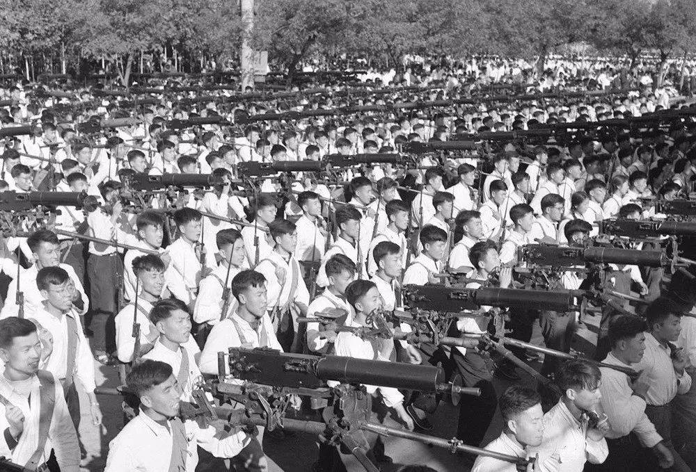 民兵們扛着密密麻麻的水冷式重機槍(應為二四式),蔚為壯觀。對於只需要守土衞鄉的民兵來講,笨重一點但火力持續性好的水冷式重機槍還是比較合用的。