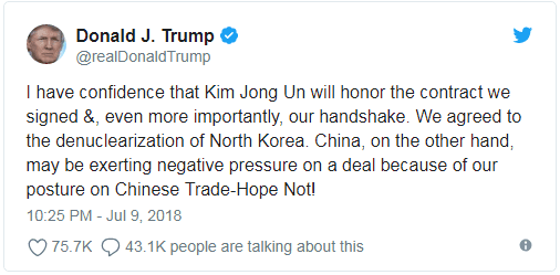 **觀察者網:**特朗普前兩日發推特,質疑中國因中美貿易戰問題,在朝鮮棄核進程上攪混水。您如何看待他這一推特?