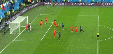第31分鐘,維爾通亨絆倒姆巴佩,法國隊獲得前場定位球機會,格列茲曼將球開進禁區,吉魯頭球一甩,皮球稍稍偏出。