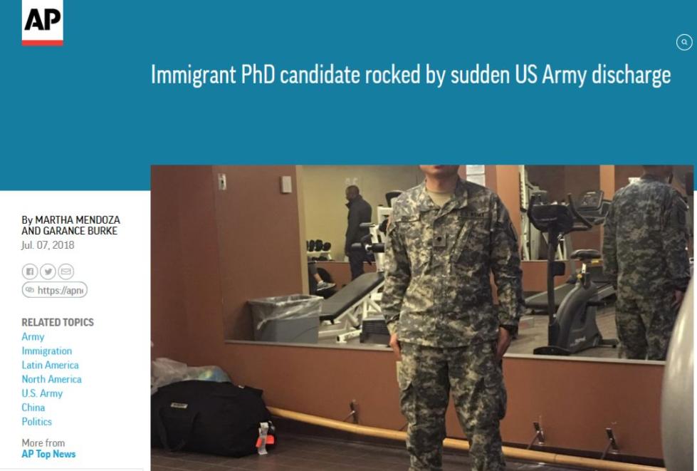 美聯社説,截至目前尚不確定已經登記被徵召卻又突然被趕出美軍的人有多少,移民律師説,最近至少至少就有40人被解約或者快被解約了。至於原因,他們中有人説,美軍壓根沒告訴他們理由。也有人説,是因為他們有親人在海外,或因為國防部還沒完成對他們的背景審查,因此他們被美軍列為了安全威脅。