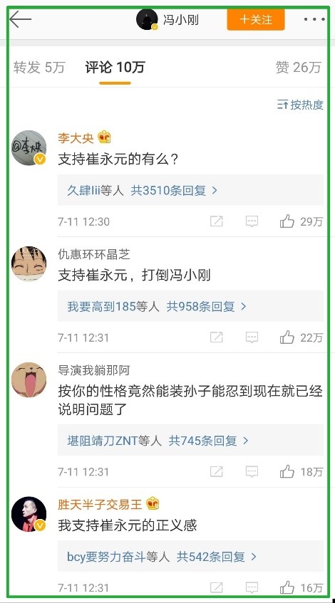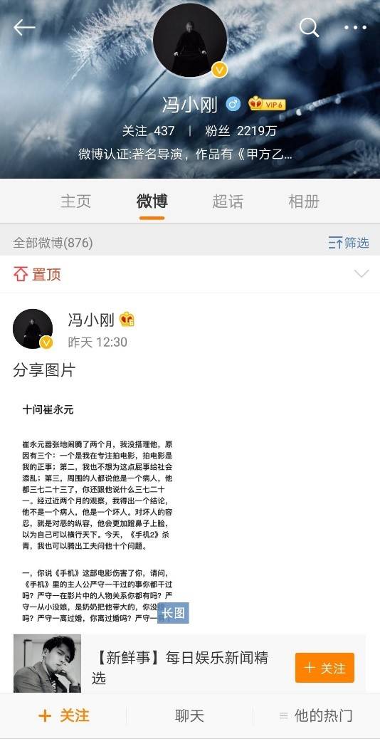 終於, 11日午間,馮小剛在個人社交平台新浪微博,發文《十問崔永元》給予回擊。