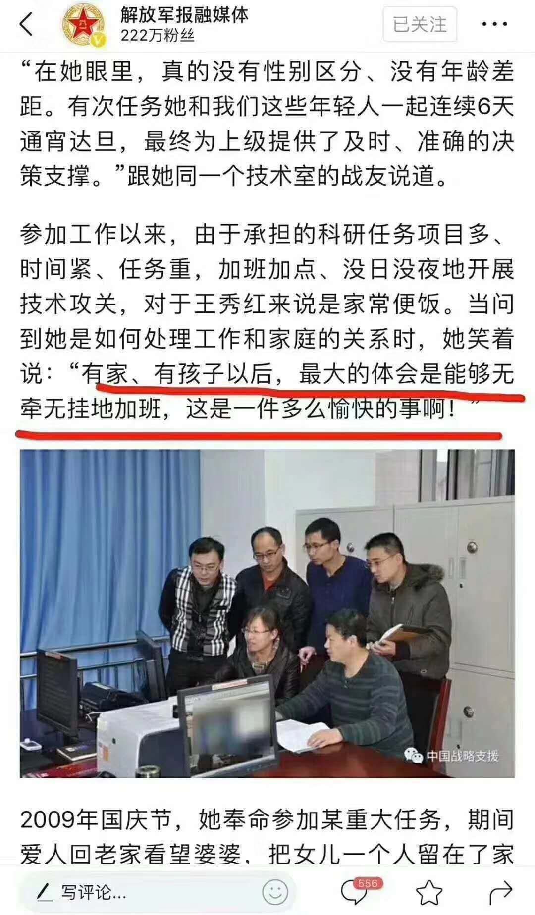 今天,朋友圈裏傳了這麼一篇宣傳某部王秀紅工程師的文章。的確,這位清華女博士非常了不起,熱愛軍隊,熱愛事業,但關鍵是宣傳稿裏記者代她轉述的一句話引起了廣泛爭議:“有家、有孩子以後,最大的體會是能夠無牽無掛地加班,這是一件多麼愉快的事啊!”