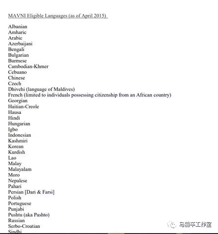 美國防部的MAVNI計劃白皮書,列出了項目希望招募的特定語種人才,漢語、俄語、阿拉伯語、東南亞、中亞、東歐、非洲各種語言均在列