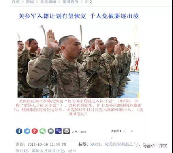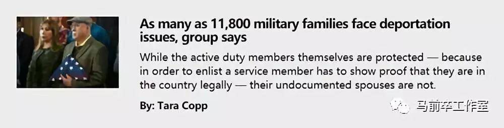 超過11800個軍人家庭面臨被遣返非法移民行動拆散的風險,至於為什麼這麼多美國退伍老兵娶了非法移民,為什麼這麼多追逐美國夢的非法移民女性不去嫁給醫生、律師、運動員、華爾街經紀人……而要嫁給退伍老兵,大家應該都知道是為什麼。當然,如果入伍參軍是美國主流社會一條理想的晉身途徑,那早就不需要什麼綠卡兵和MAVNI項目了。