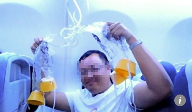 圖為國航106航班旅客展示掉落下來的氧氣面罩