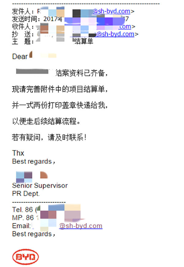 第三張截圖則顯示出了供應商們得到的李娟分派的“項目”,李娟(或其員工)使用地址為“@sh-byd.com”郵箱與供應商溝通敲定合同、結算項目後續費用等事宜,而“@sh-byd.com”郵箱正是比亞迪官方聲明中一再強調的李娟與其員工所用的“盜版”郵箱。