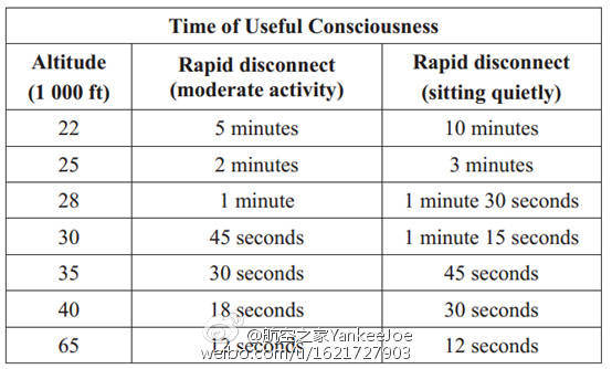 在35000英尺高度,如果客艙內沒有加壓人體將在半分鐘內陷入昏迷