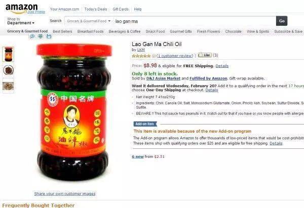 不過在美國亞馬遜上,280克的老乾媽豆瓣辣醬賣8.98美元(大概58軟妹幣)。