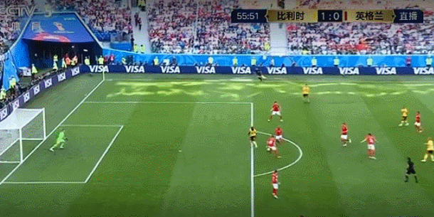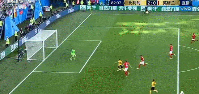 比利時門將庫爾圖瓦發起了一次看似沒有威脅的進攻,經過了四五次傳遞,由 中路的盧卡庫擺渡,左側的德布勞內傳中,穆尼耶破門,整個過程英格蘭防守門户大開。