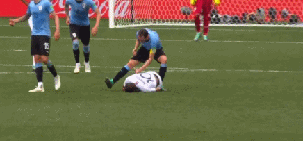 在比賽領先的時候,禁區前沿姆巴佩無故摔倒,意圖可以説是十分明顯了。不過烏拉圭球員可不吃這一套,隊長戈丁一把掀起姆巴佩,尷尬的姆巴佩也只得硬着頭皮繼續“表演”。