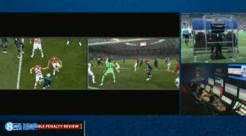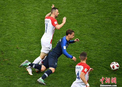 第33分鐘,法國隊獲得角球機會,打入扳平球的佩裏西奇禁區內手球,主裁判觀看VAR系統後判定點球。格列茲曼主罰命中,這個點球也是歷史上世界盃決賽中第一個由VAR系統進行判定的點球。而世界盃歷史上第一個由VAR系統改判的點球,正是本屆世界盃法國隊與澳大利亞的比賽中獲得的。