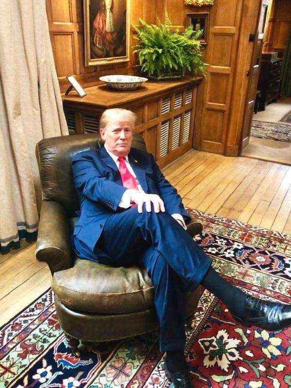 在美國白宮發言人桑德斯發佈的這張照片中,特朗普翹着二郎腿,坐在丘吉爾當年坐過的椅子上。