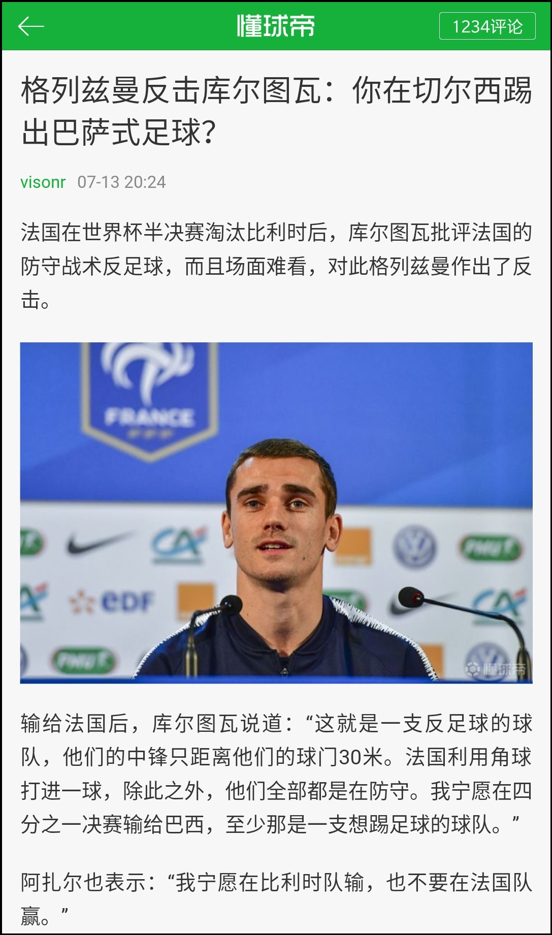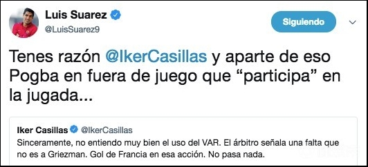 西班牙前國門卡西利亞斯在推特上評論道:“説真的,我不是很理解VAR的使用。裁判判給了格列茲曼一個不存在的任意球。法國隊因此獲得了進球。實際上什麼事也沒有發生。”