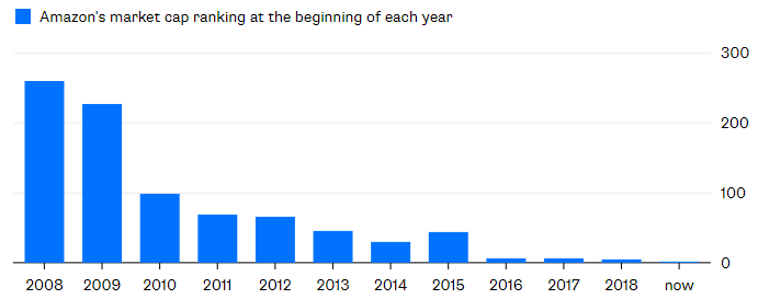 2011年夏季,當蘋果超過埃克森美孚,成為全球市值最高的公司時,亞馬遜剛勉強擠進市值前50,然而,近僅僅七年時間。亞馬遜與蘋果的差距就已經縮小到一步之遙了。