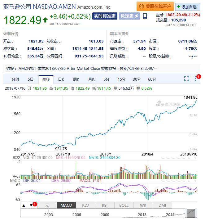 這一年時間亞馬遜市值翻了一倍,高達8700**億美元