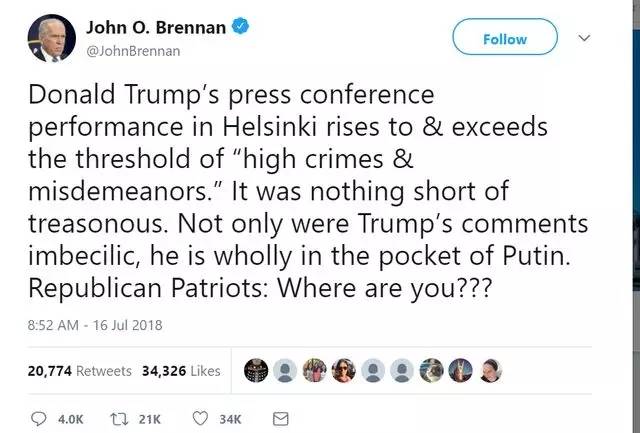 目前,堅信俄羅斯干涉了美國總統大選的美國主流媒體、情報人員以及外交人員,已經直接把特朗普的行為定性成了“叛國”。美國CNN新聞網就在最新的報道中引述美國CIA前負責人約翰·布倫南的説法稱:特朗普的行為“可以説是叛國了”。
