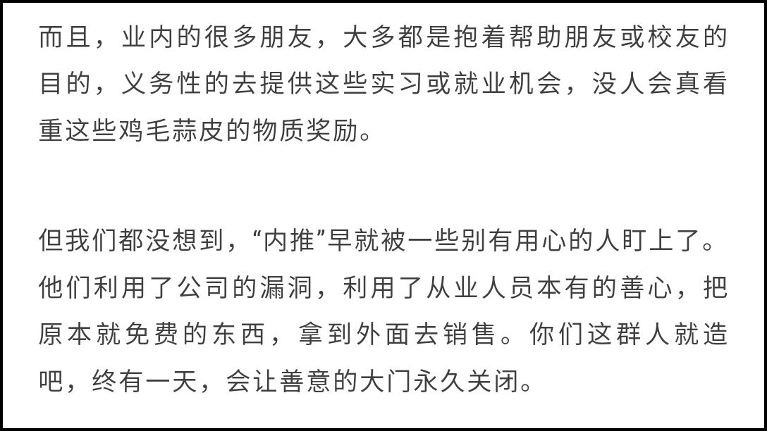 文章主要抨擊了部分金融業內人員和中介機構相互勾結,售賣內推名額的現象。