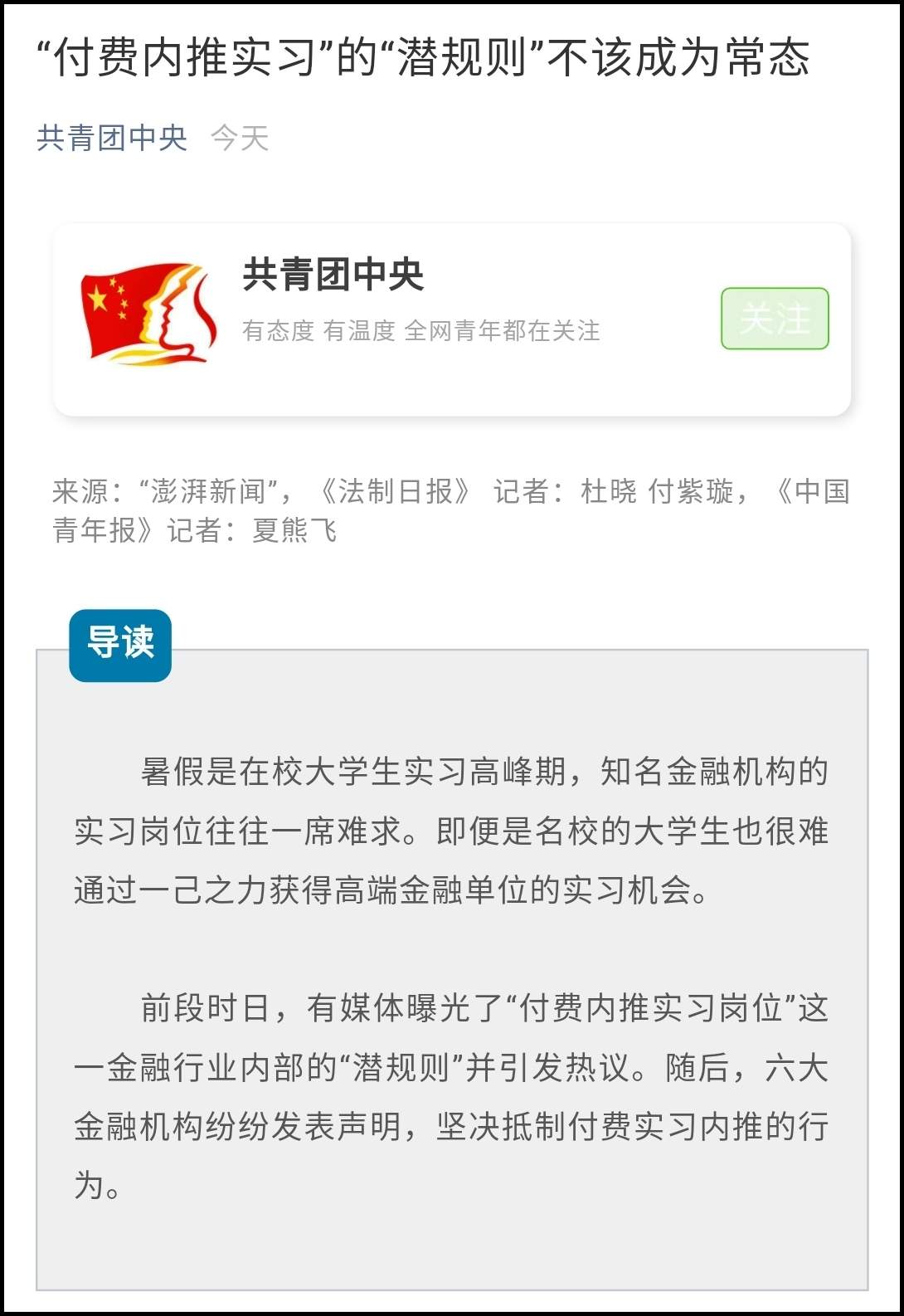 7月19日,共青團中央的微信公眾號發佈了文章《”付費內推實習“的”潛規則“不該成為常態》,批評了這些中介機構的行為,並呼籲有關單位抵制此類現象。