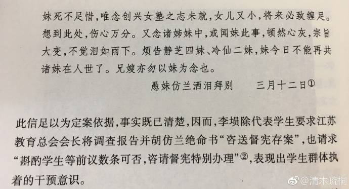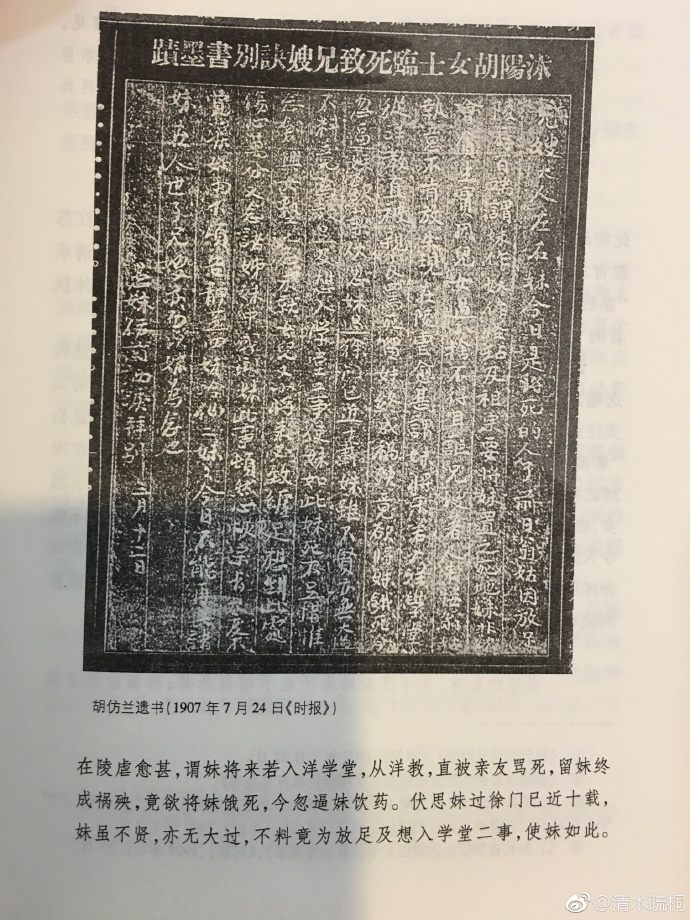 胡仿蘭的遺書見圖四五六,太難過了,她快死了,所念念不忘的只有兩件事,一是怕她的女兒被纏足,一是怕因為自己之死會給別的女性求學帶來消極影響,最後想到了魯迅先生的話,翻來史書,裏面寫着兩個大字,吃人。