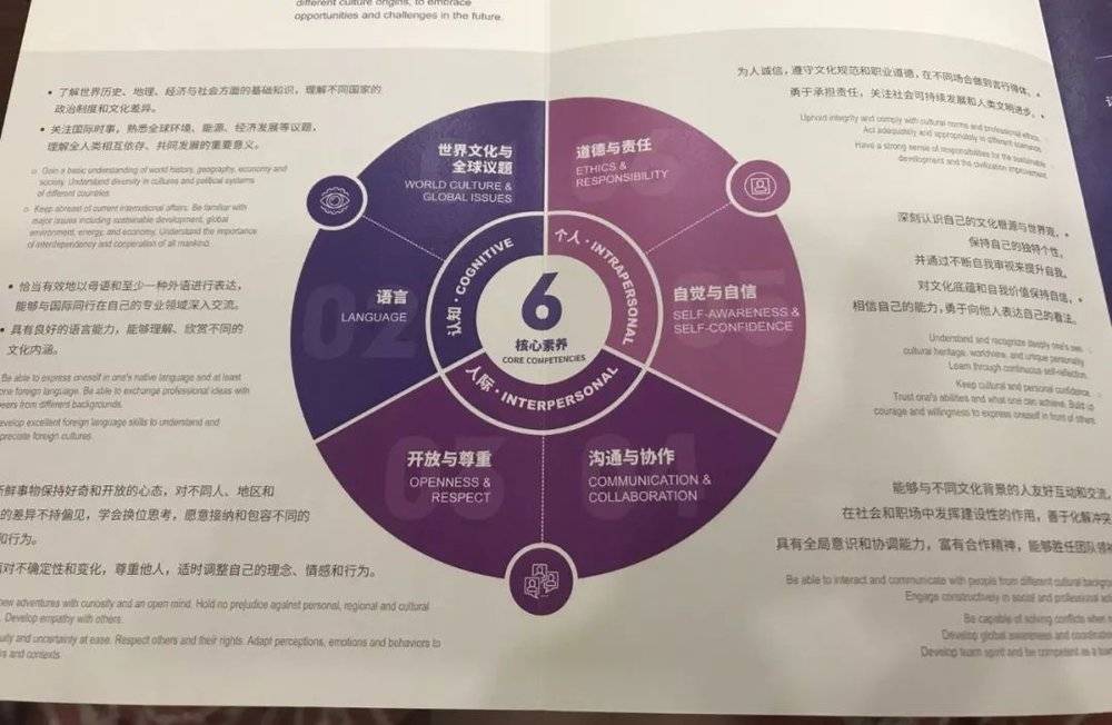 那到底什麼是全球勝任力?中心有下面這樣一個模型。分了三個方面,一個是個人層面,包括道德與責任,自覺與自信。一個是人際層面,包括開放與尊重,溝通與協作。最後一個才是認知層面,包括世界文化與全球議題,和語言。核心其實是前兩個方面,語言和議題是外殼,沒有前兩個,那無非是語言花哨,誇誇其談,是無源之水。