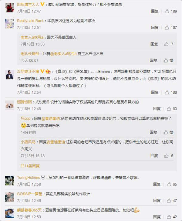 在吳彥祖看來,《荒原》就是一部動作戲,除了《權遊》以外,很多入選的劇目壓根不能算是動作戲。《荒原》也正是靠動作戲吸引了很多粉絲。