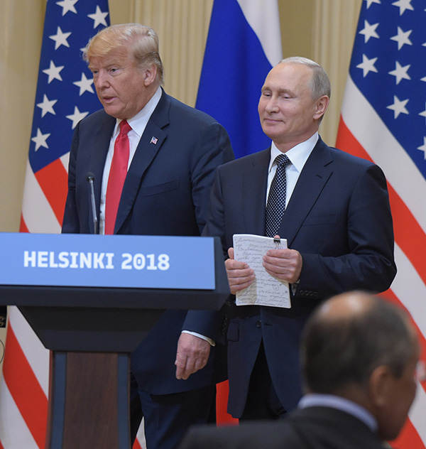 特朗普與普京首次正式會晤後參加記者會。視覺中國 圖