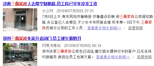 搜索一下三鼎家政的相關新聞,全部都是公司跑路,關門停業,無人服務,但欠薪不退款的消息。