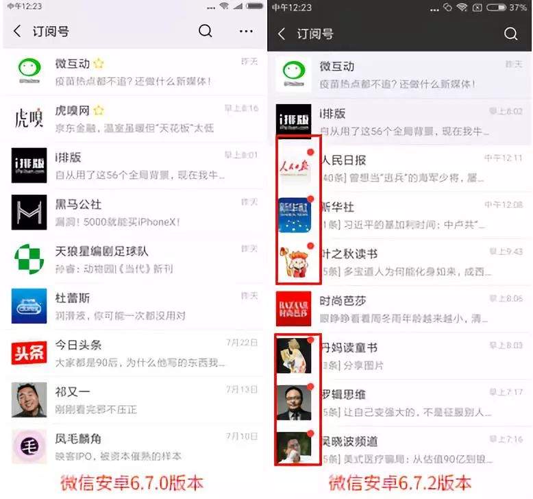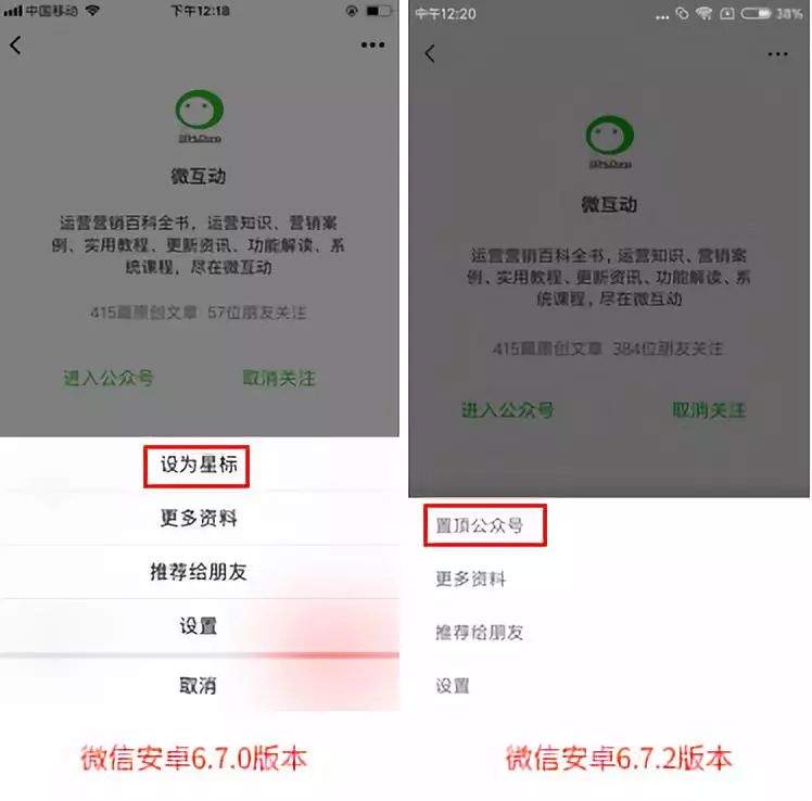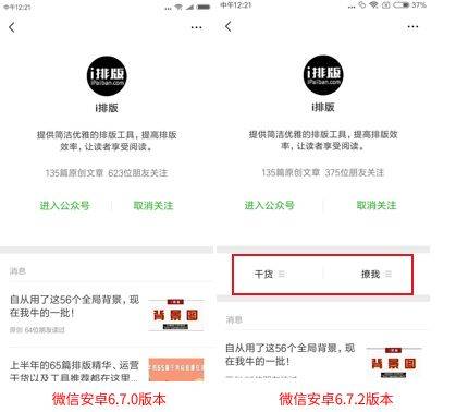 不再是6.7.0改版時的“設置星標”,只能添加標記。“置頂公眾號”功能全面迴歸,意味着,打開公眾號,首先看到的已置頂的賬號信息,方便對常用賬號的管理和信息查找,再也不用在漫天的信息流裏找不到方向。