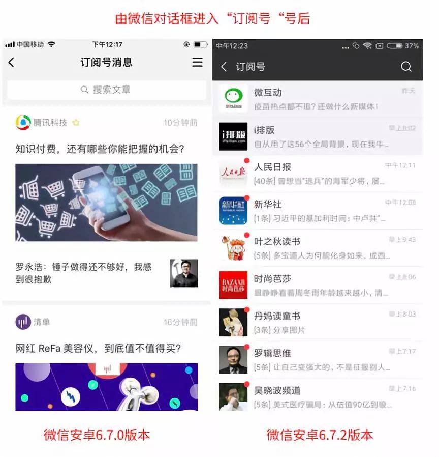 由微信對話框進入之後,直接呈現的是微信訂閲號列表框,而,微信的6.7.0改版時,首先呈現的是按時間排序的信息流。