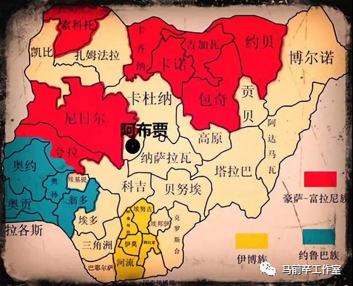 尼日利亞三大民族分佈示意圖,現首都阿布賈是1976後興建的新城,位置上座落在三大民族分佈區中間。