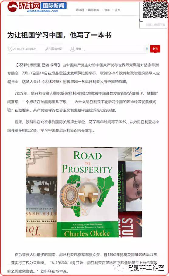 7月17日至18日,在中國與世界政黨高層對話會非洲專題會召開期間,《環球時報》以《為讓祖國學習中國,他寫了一本書》為題,報道了一位名叫查爾斯·歐科科的尼日利亞商人。