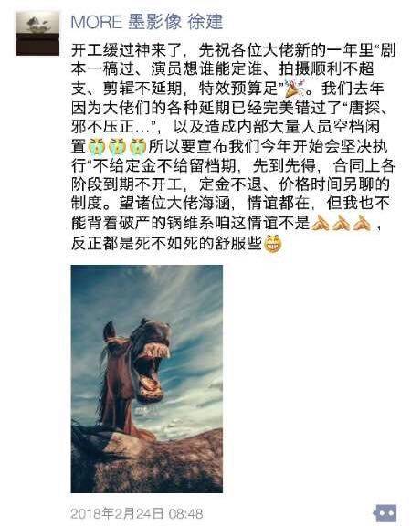 徐建表示,去年因為製片方延期,公司錯過了幾個大項目,造成大量人員空檔、資源閒置,今年要堅決執行定金措施,他在最後寫道:“望諸位大佬海涵,情誼都在,但我也不能揹着破產的鍋維繫咱這情誼不是,反正都是死不如死的舒服些。”
