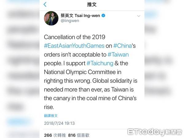 蔡英文説,在中國意志強行主導下取消2019東亞青運的決定,對台灣人民來説,完全無法接受。「我全力支持台中市政府以及中華奧會採取任何必要的手段、以力爭我們應得的正義。」此時,全球團結起來更加重要,因為台灣就像是在礦坑裏的金絲雀,提醒世界,中國所釋放的信息。