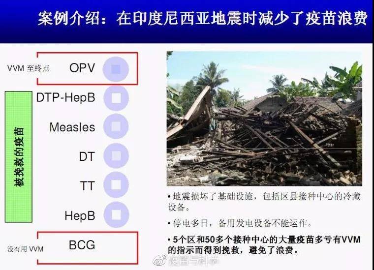 在震驚全球、導致無數人失去生命的印尼地震海嘯事件中,基礎設施全部停擺。疫苗全部失温多天,但只有對温度最敏感的脊灰口服疫苗確認報廢,其他疫苗都因為貼了VVM,確認不報廢而可以繼續使用。