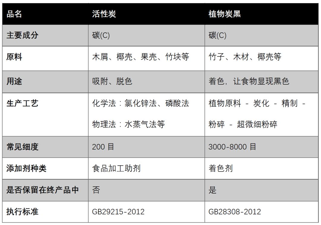 此外,它們的生產工藝和執行標準也完全不同。我們整理了一個關於植物炭黑和活性炭的對比圖表,大家可以參考一下。