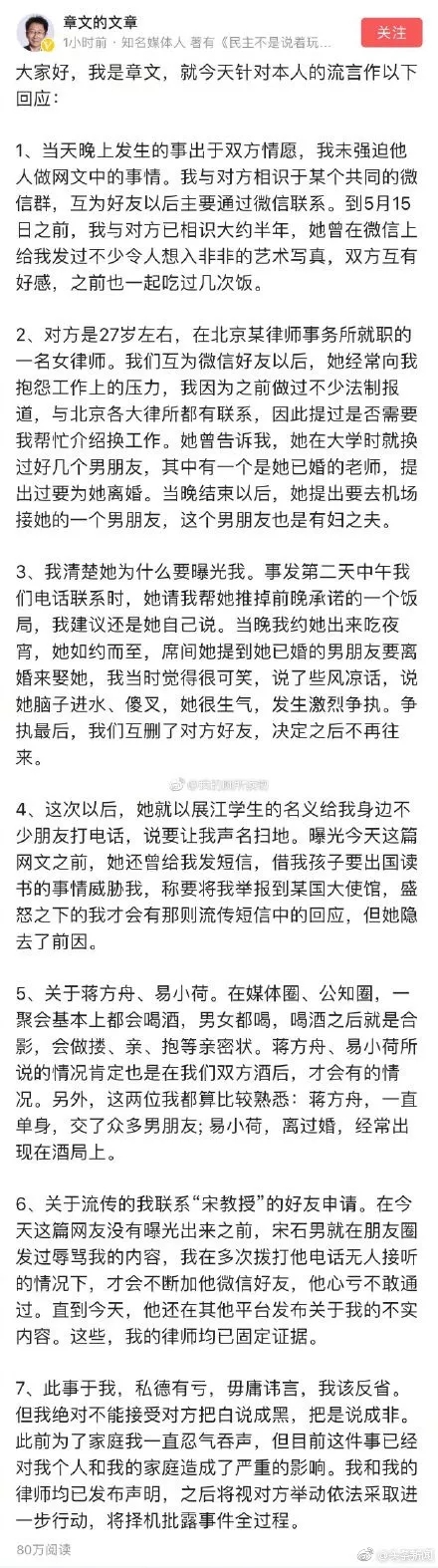 而作為媒體人被指控方陣代表的章文,則在事件爆發後發出了一份回應,行文堪稱教科書級別“受害者有罪論”。在這份回應裏,章文首先回應匿名“強姦指控”,稱事發出於雙方自願,隨後稱匿名指控者與有婦之夫交往,同時稱“蔣方舟,一直單身,交了眾多男朋友; 易小荷,離過婚,經常出現在酒局上”。