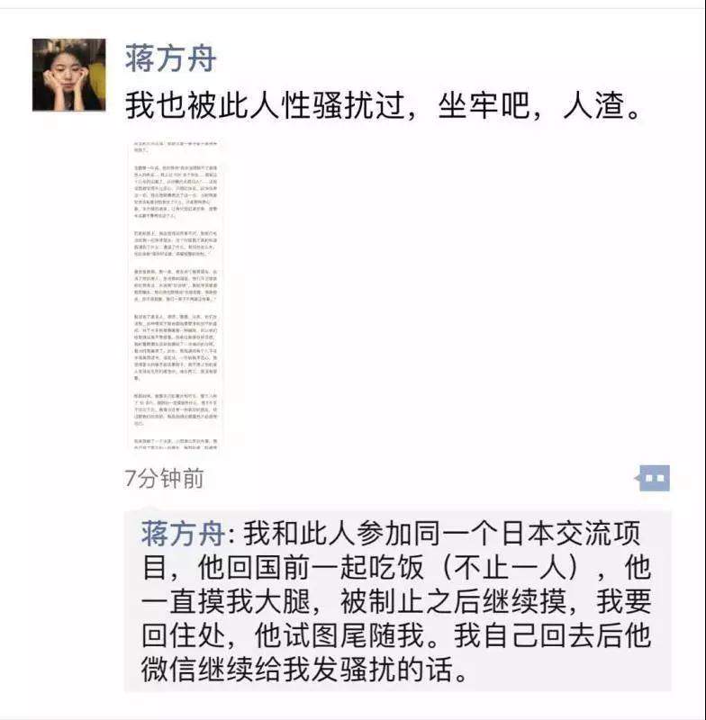 7月25日凌晨,舉報章文強姦的文章在網上發佈後,青年作家蔣方舟和資深媒體人易小荷也在隨後實名發聲,稱也曾被章文摸大腿,蔣方舟表示“他一直摸我大腿,被制止之後繼續摸,我要回住處,他試圖尾隨我。我自己回去後他微信繼續給我發騷擾的話。”