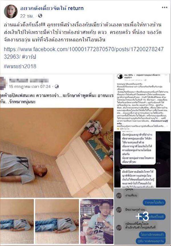真相已經很明顯了,Tachawit裝死,並讓妻子發Facebook,聯繫親友,就是為了騙錢。