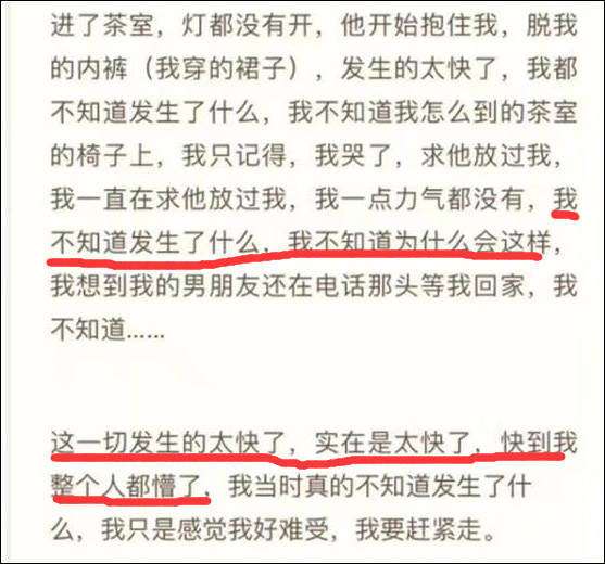 被章文性侵的女生同樣也很懵。“我不知道發生了什麼,我不知道為什麼會這樣。”