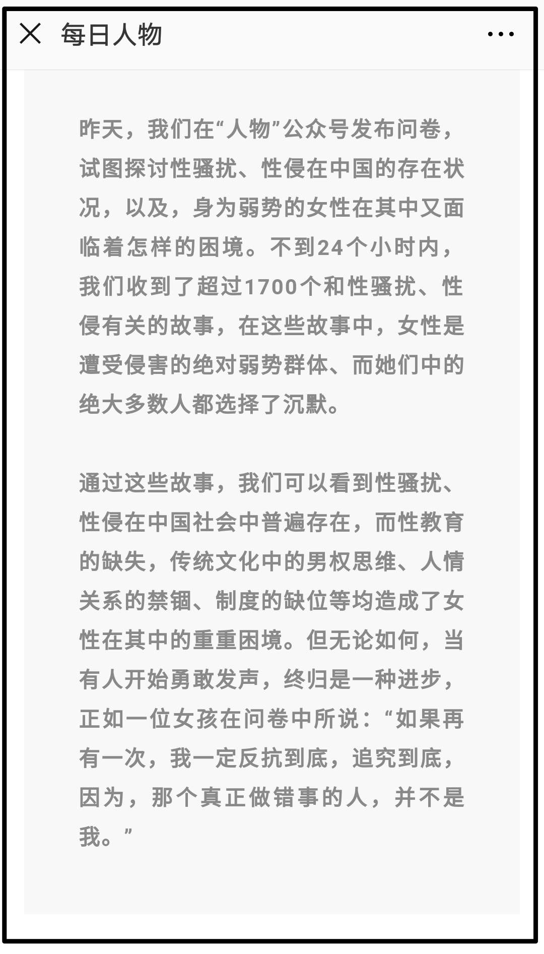 據微信公眾號【每日人物】在7月26號的問卷顯示,在24小時內已經收到1700個和性侵、性騷擾有關的故事。