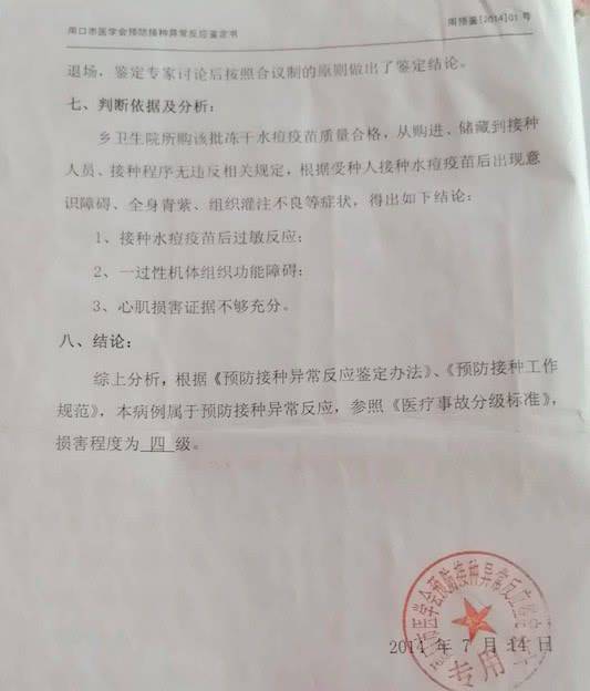 周口市醫學會為張櫻山出具的預防接種異常反應鑑定報告