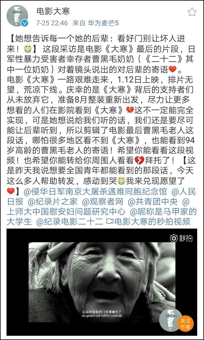 7月24日,電影《大寒》的官方微博以近乎卑微的語氣寫下《你願意為我轉發,讓更多的人知道“我”嗎?》的文字:
