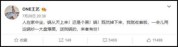 此外,她還很憤怒地發了條微博説:“人在家中坐,鍋從天上來”↓