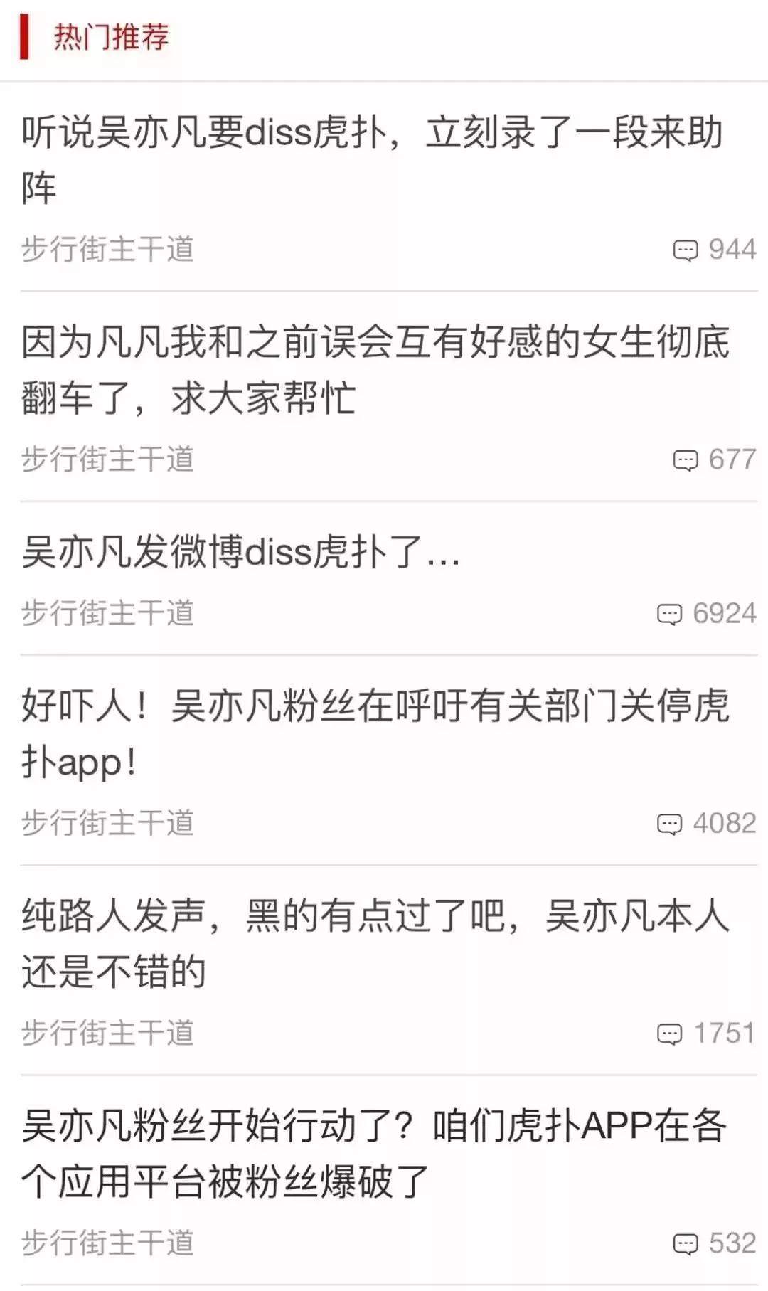 虎撲步行街則成為與吳亦凡粉絲互撕的根據地。罵戰開始之前,微博帳號“虎撲的步行街”有66萬粉絲,而吳亦凡粉絲是3223萬,近乎1:50的差距。