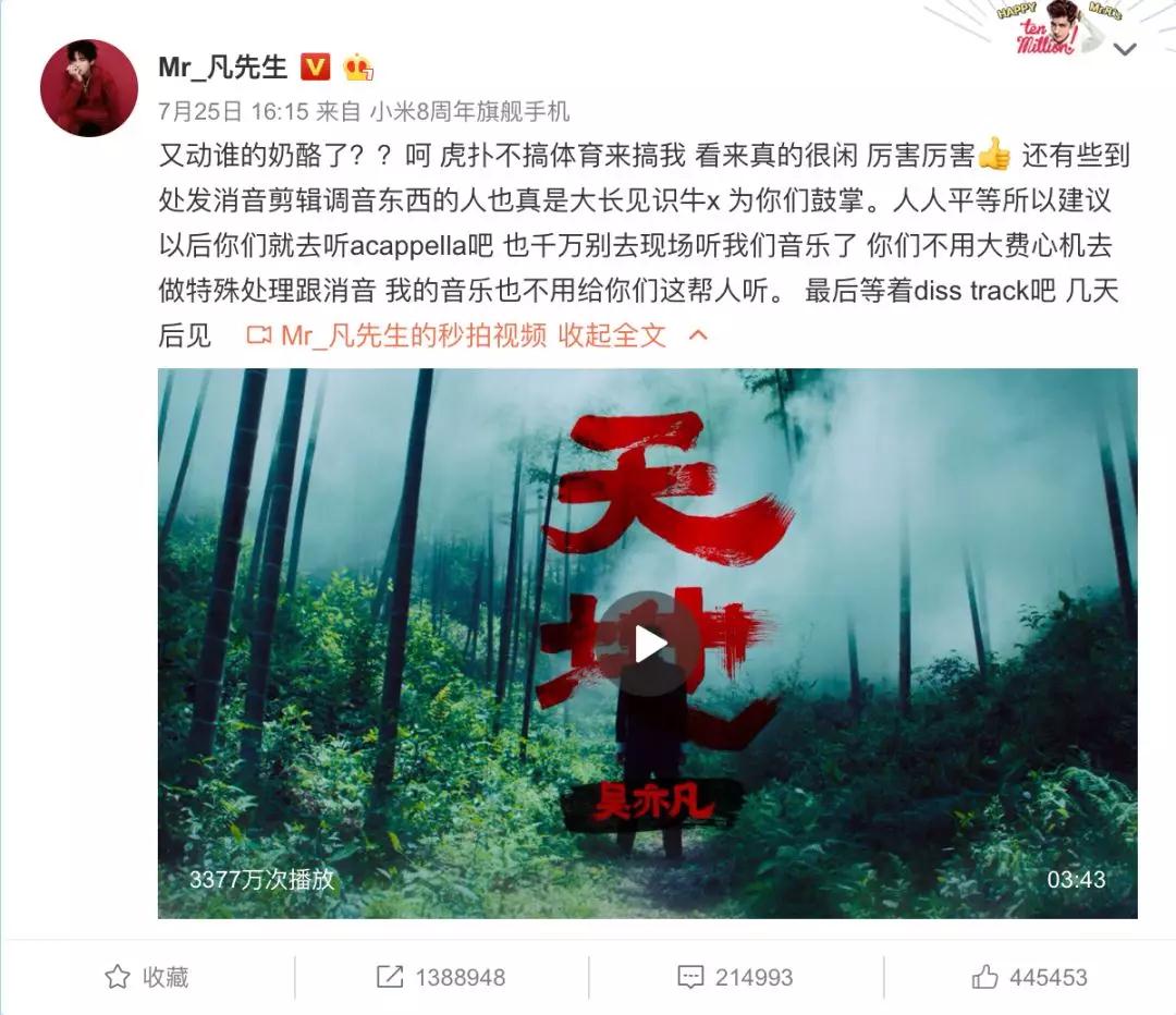 7月25日下午,吳亦凡本人出面回應,他發佈微博稱:“虎撲不搞體育來搞我,看來真的很閒。”“你們不用大費心機去做特殊處理跟消音,我的音樂也不用給你們這幫人聽。”他叫板虎撲,讓他們等着diss track。