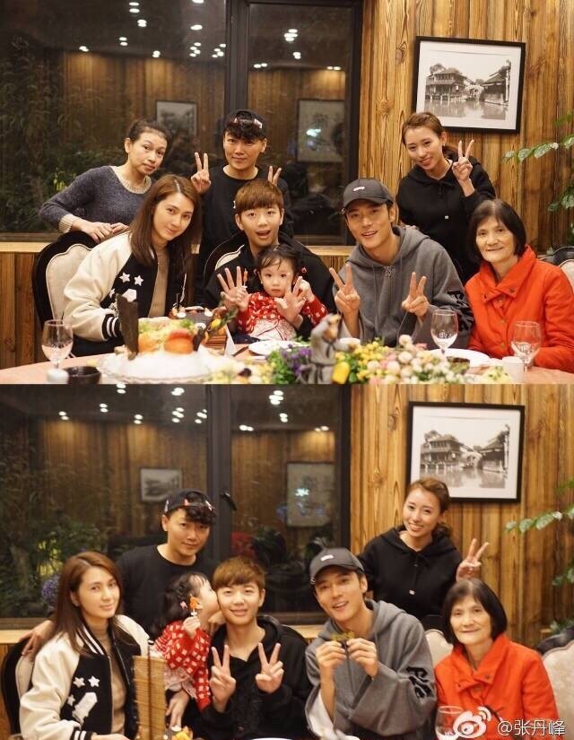 這個彤彤生日我不能跑中間站着吧,我和助理一人一邊很正常,至於頭朝向……一張向右一張向左。一家四口的照片都是我拍的,拍完最後峯哥説一起大合影留個紀念。