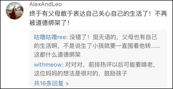@Particular_dance:評論都説幫襯一點,那是站在自己的角度上。要是自己有孩子,難道不會贊同這個媽媽的做法嗎?作為媽媽的角度考慮,我贊同。雖然我生了你,但是人生還是要自己走的,我也有我自己的生活,為你披荊斬棘二十年,也需要你獨立行走了。
