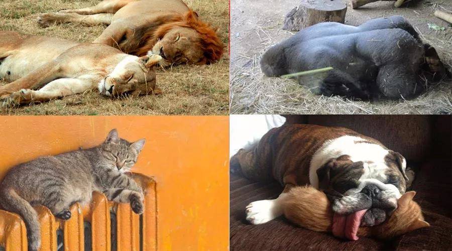 這種頸椎的前凸曲線,帶來第一個大問題就是睡覺了,下圖是哺乳類動物的常見睡姿。