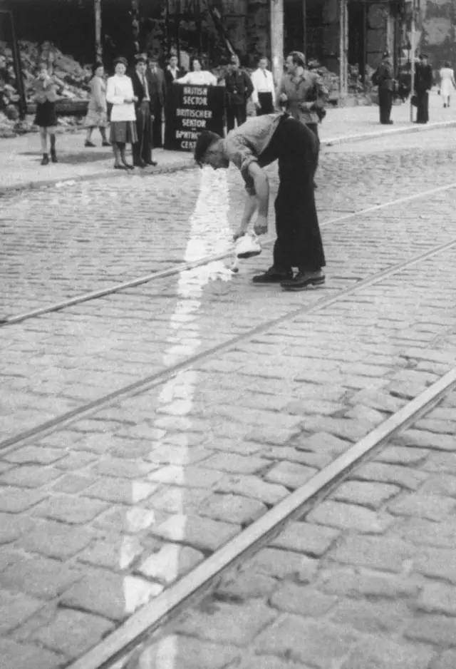 ▲一名工人在柏林的波茨坦大街上畫出分界線